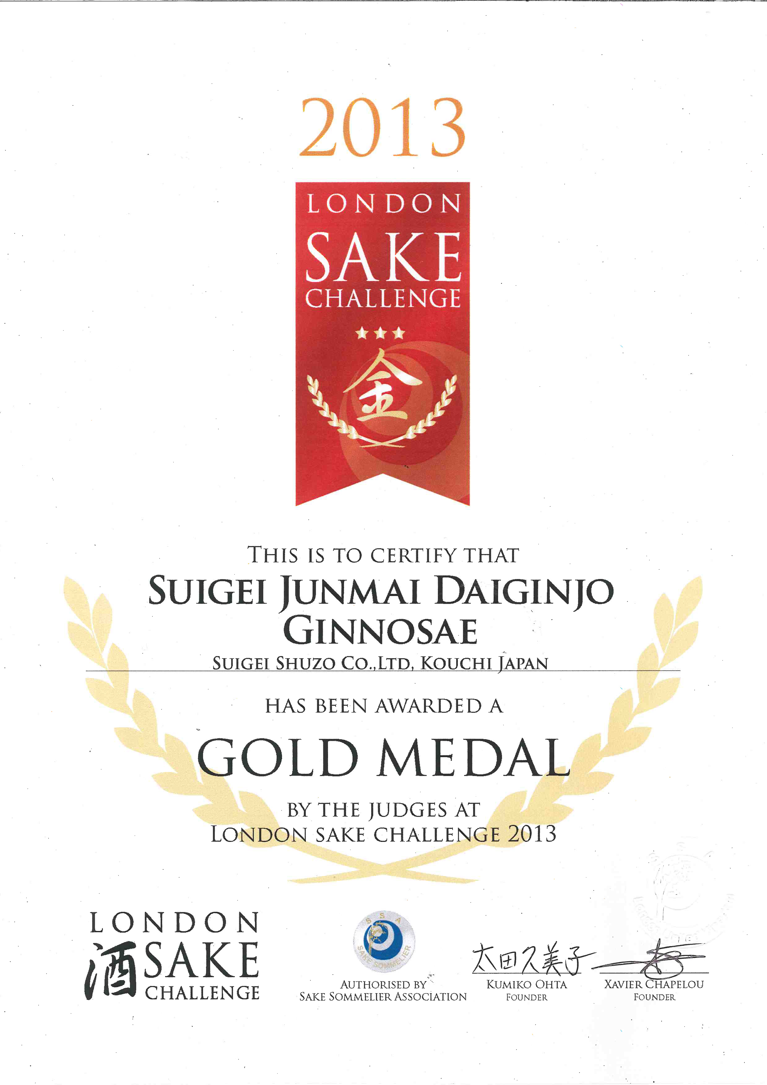 8月19日にロンドンで開催されました「ロンドン酒チャレンジ2013」にて弊社商品「酔鯨 純米大吟醸 吟の冴」が金賞を受賞しました。